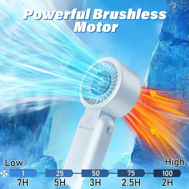 3 Seconds Cooling & 5 SpeedsOur hand held fan is equipped with a high-quality brushless motor and 5-blade design for poweful airflow. 5 adjustable wind speeds can be switched with one click to find your perfect cooling intensity with ease. Keeps you cool and comfortable whether you're working, sleeping or traveling