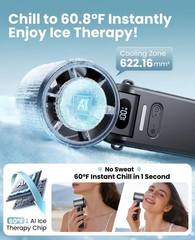Instant Ice Cold Semiconductor Cooling Technology: Featuring upgraded semiconductor cooling chips and a direct-skin-contact cooling plate this portable hand fan generates a stream of chilled air instantly upon startup, functioning like a personal air conditioner. Please note: Prolonged use of the cooling function consumes a lot of power. Please turn off this function when not in use