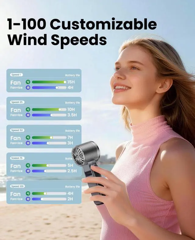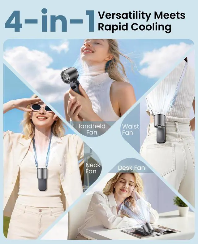 "25000RPM Ulimate Cooling Experience This handheld personal fan adopts an advanced 6-blade design and is equipped with a high-speed three-phase brushless motor, with a maximum wind speed of up to 10m/s. Maximum speed is 25,000 rpm, which is 3 times that of ordinary handheld fans. Whether you're enduring the scorching sun at an outdoor sports event, a crowded concert, or cooking in a stuffy kitchen, it provides an exclusive oasis of coolness anytime, anywhere"
