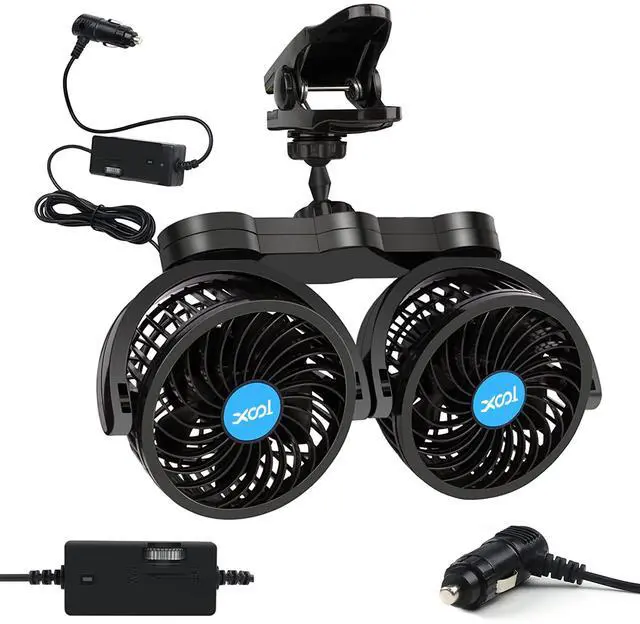 • Adjustable DesignWith a big speed controller, you can change wind speed easily and effortlessly according to your feeling. Stepless speed regulation which has no specific wind speed setting limit maximizes your comfort; Adjustable dual-head car fan provides cooling air circulation in any desired direction with 360-degree tilt rotation