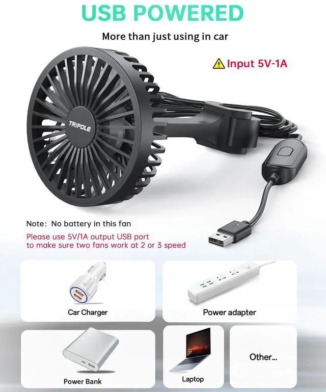 | Super Quiet | The car backseat fan has a built-in brushless motor and the fan works very quietly with low noise close to 30dB. |