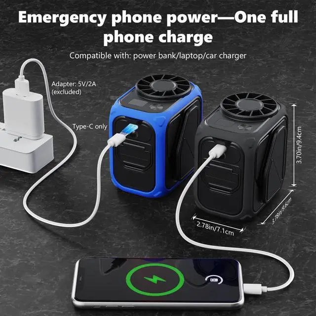 10,000mAh Marathon Battery & Emergency Power BankThe 10,000mAh battery delivers 6-20 hours of non-stop cooling (speed-dependent, outlasts most mini fans) with LED screen clearly displaying remaining battery %eliminate charging guesswork. Doubles as an emergency power bank to provide at least 1 full charge for a dead smartphone during hikes, work shifts, or blackouts. Never run out of poweranywhere, anytime.