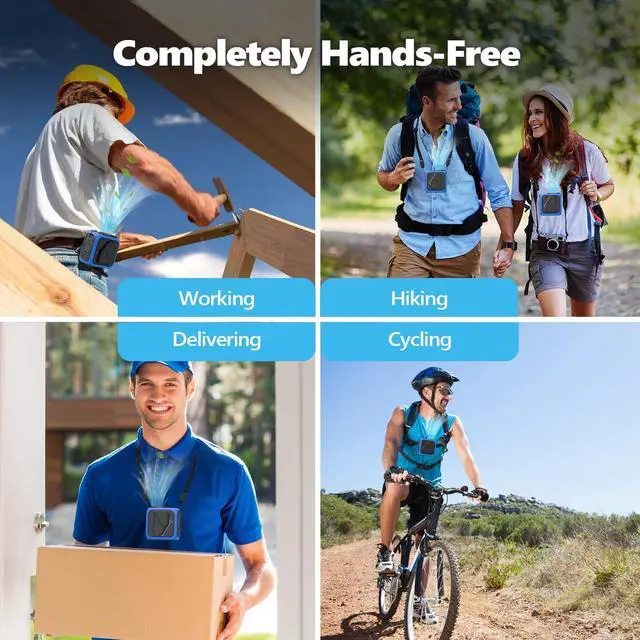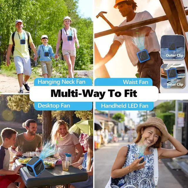 4-in-1 Hands-Free Cooling FanWaist Fan-Clip it to your waist, belt, or clothes; Neck Fan-hang it around your neck; Desk Fan-place it on a desk with the stand; or Handheld Fan-carry it handheld. Versatile design adapts to any scenariogardening, hiking, biking, or work. Adjustable clips, lanyard, and stand ensure total freedom for your hands. Additionally, its equipped with a super-bright LED light, making it perfect for nighttime walks and outdoor adventures.