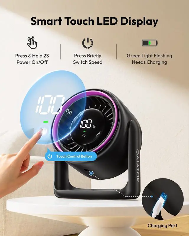 GAIATOP Desk Fan with Intuitive Touch-Sensitive LED Display & 4000mAh Battery