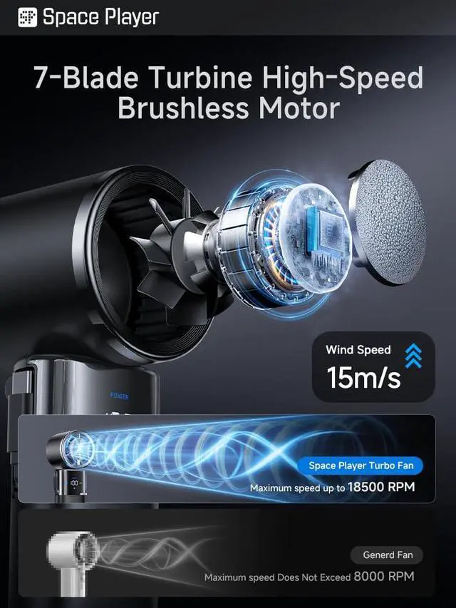 10,600+ RPM Turbo Power High Speed Airflow Utilizing aviation-grade turbo fan technology, this portable handheld turbo fan generates an intense 15m/s (33.6 mph) wind speed, covering a 3m range3x stronger than standard blade fans. Experience instant heat dissipation with penetrating airflow for wide-area cooling