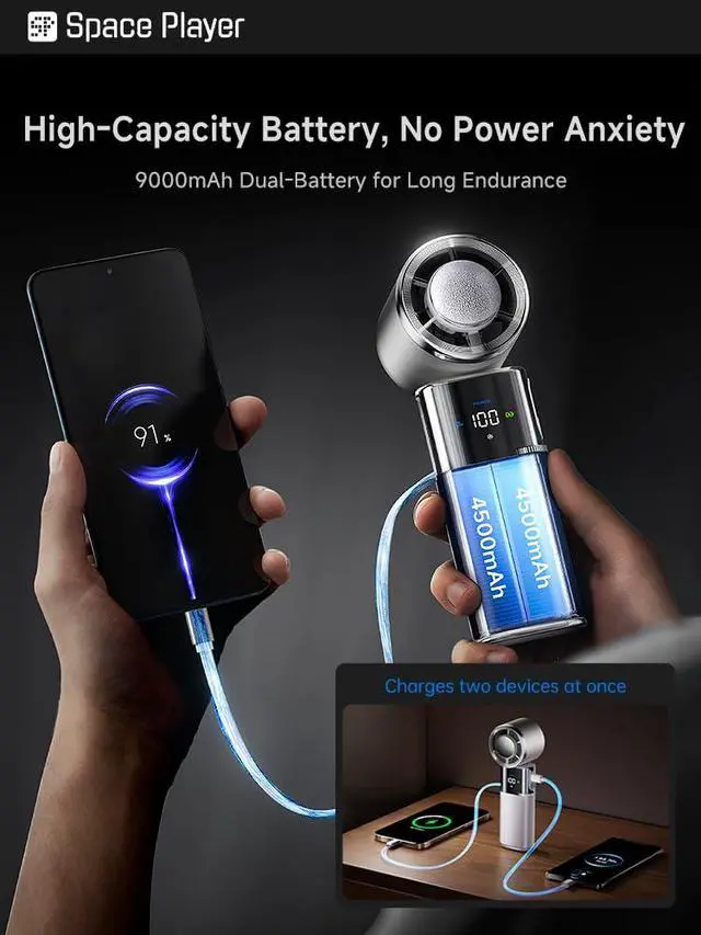 9000mAh Large Battery + Power Bank Function The rechargeable handheld fan features a built-in 9000mAh long-life battery for all-day operation without frequent charging. 12-48hr runtime (varies by speed). A Type-C port allows reverse charging for your phone, making it ideal for outdoor activities or emergency power needs