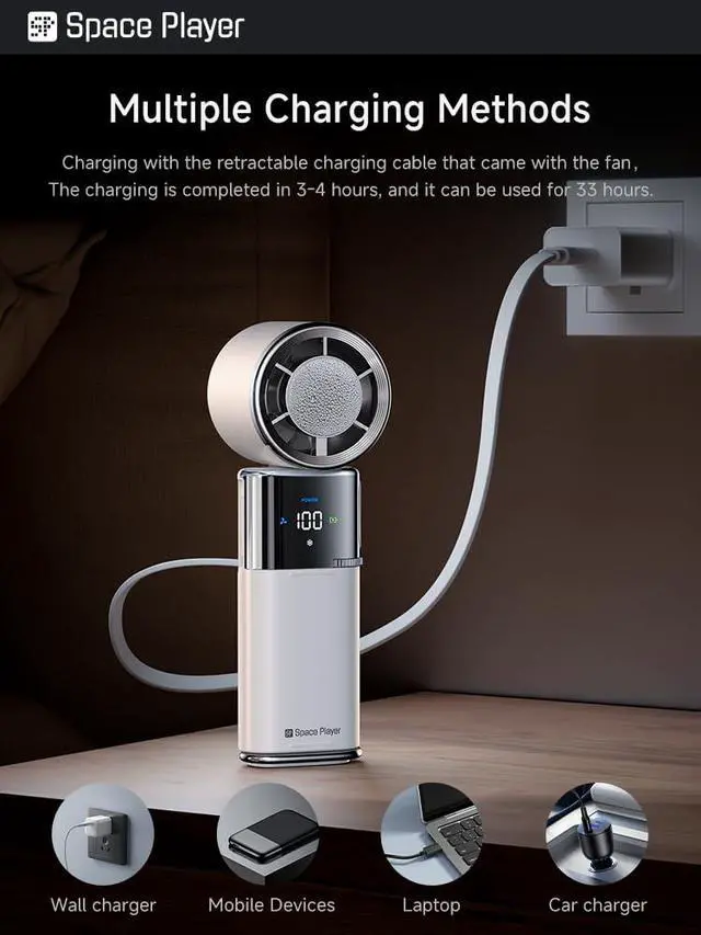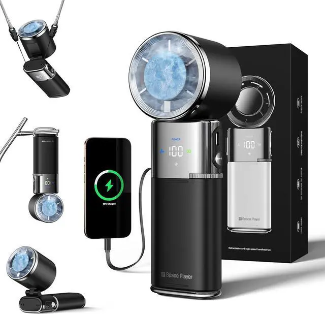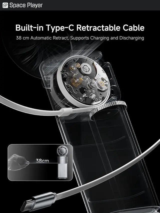 Hidden 38cm Retractable Type-C Cable An integrated retractable Type-C cable (38cm) stores neatly inside the fanpull it out for charging and retract with one click. No need to carry extra wires; stay connected effortlessly on the go
