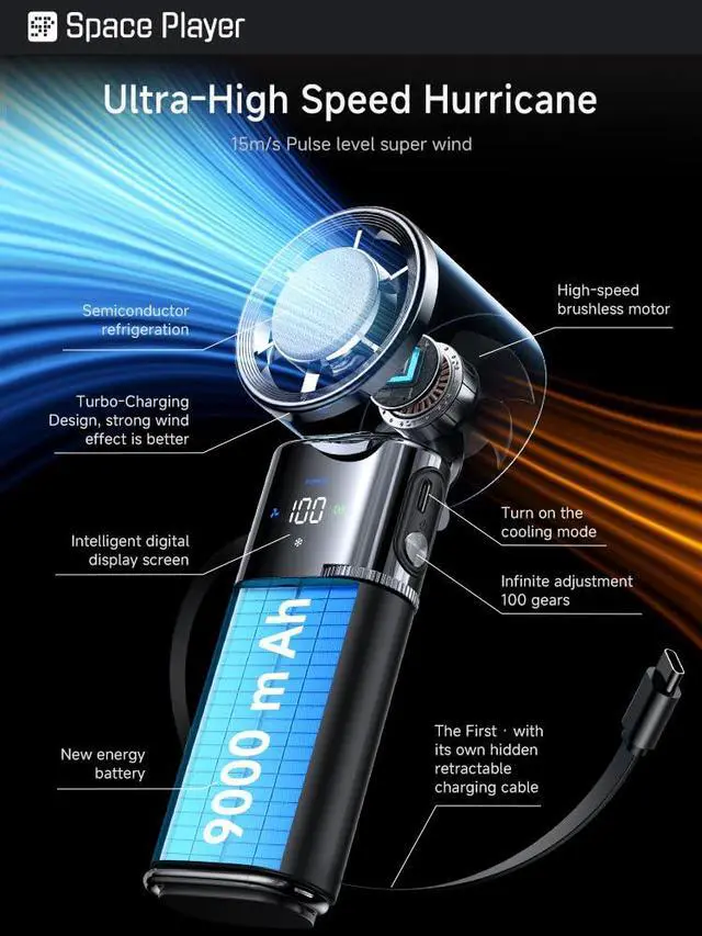 100-Level Stepless Speed Control + LED Display The stepless knob enables precise adjustments in 0.1 increments, with an LED screen showing real-time wind speed (1-100 levels) and battery life. Customize your cooling experience with unmatched precision