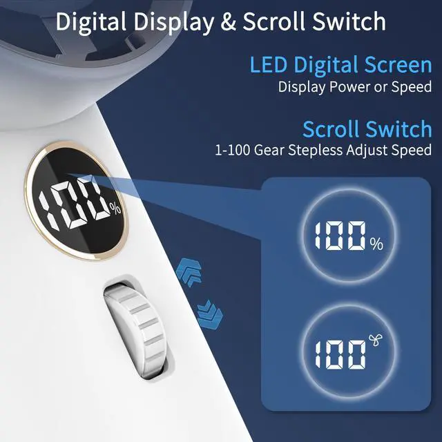 Digital DisplayThe hand held fan built-in digital display, can real-time show the current fan speed, or can show the battery power by double the Scroll Switch. You can visualize the fan's speed as well as the remaining battery power.
