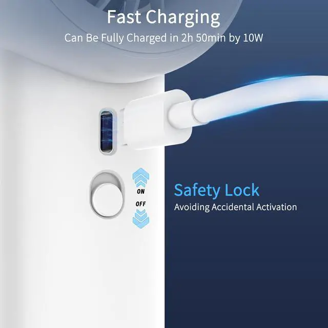 5000mAh Rechargeable BatteryThe rechargeable portable fan equips with a large battery, provides a super long working time. The more larger capacity of battery, the more endurance the handheld fan provides. The energy storage of the portable fan is capable of meeting your whole day cooling needs.