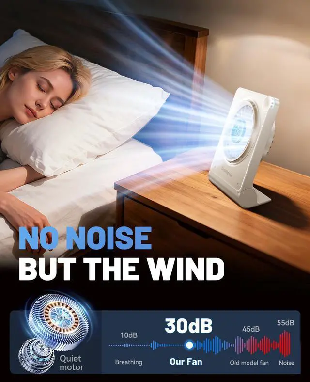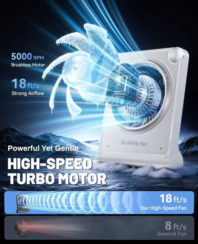 Powerful & Ultra-Quiet Airflow: Driven by a 5000RPM motor with advanced fan blade design, this quiet desk fan delivers strong wind speeds up to 18 ft/s while maintaining whisper-quiet operation at just 30dBperfect for office, bedroom, and library use without disturbing others.