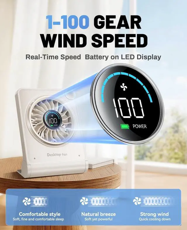 0100 Speed Adjustment & LED Display: Rotary knob allows precise speed adjustment from 1 to 100 levels for customized cooling. The LED screen displays real-time speed and battery level, with a low-battery warning when power drops below 10%.