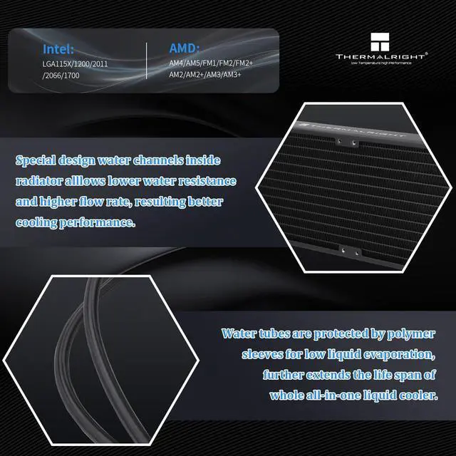 Better Cooling Water block with full copper mirror plane base + 360 specification black aluminum fin cold plate + high polymer woven protective water pipe + standard 120mm argb fan to create low resistance, high cooling, low evaporative, long-life integrated water-cooled cooler.