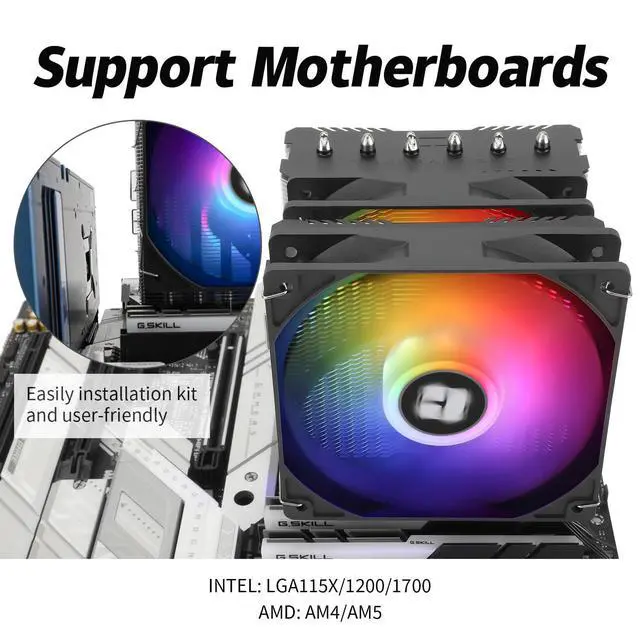 2 PWM FansModel:TL-C12C-S; Colorful and gorgeous ARGB light effects; Standard size PWM fan:120x120x25mm (4.72x4.72x0.98 inches); Fan speed (RPM):1550rpm±10%; Power port: 4pin; Voltage:12V; Air flow:66.17CFM(MAX); Noise Level25.6dB(A), leave room for memory-chip(RAM), so that installation of ice cooler cpu is unrestricted.