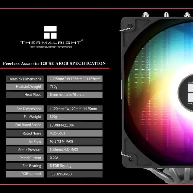 [Better cooling] With soldered heatsink base and heat pipes, and anodized brushed black top cover and Nickel-plated heat pipes, Peerless Assassin 120 SE ARGB offers greater look and stable performance output. The heatsink has offset asymmetric layout, which allows better graphics card and motherboard compatibility.