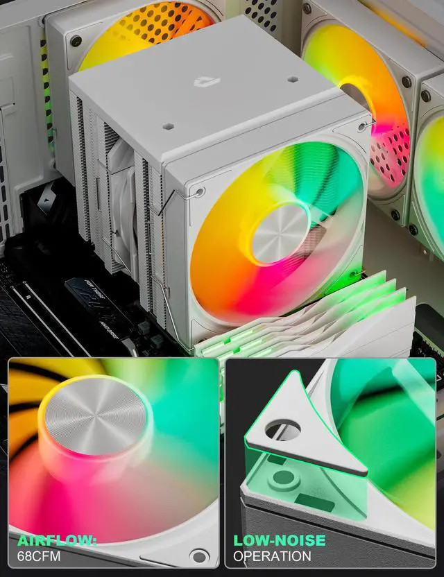upHere UE2TC6 is a powerful CPU air cooler with a sleek white design. Features 6XF6mm heatpipes and dual PWM fans for efficient heat dissipation. Compatible with Intel LGA2066/2011/1851/1700/1200/115X and AMD AM4/AM5. Maximum TDP of 265W and compact 155mm height.