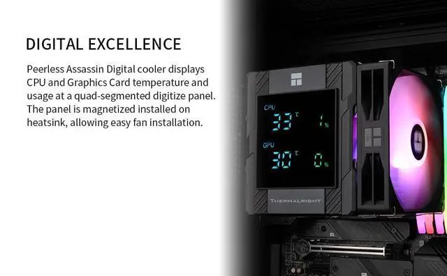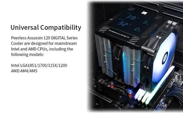 Peerless Assassin 120 Digital ARGB Black CPU Cooler, Double 120mm PWM Fans with 1850RPM Speed, Support Intel lga1700/1851/115X, AMD: AM4/AM5, Computer CPU Cooling, Digital Screen Top Cover