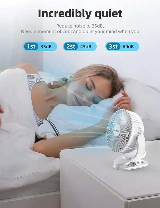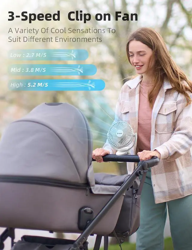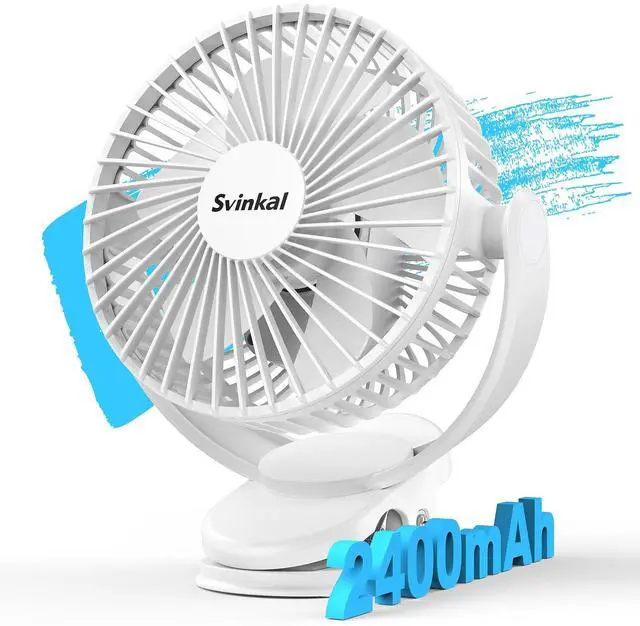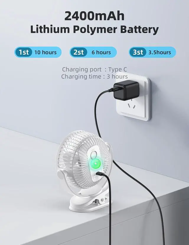 Clip on Fan2400mAhThis battery powered fan can work continuously For 10h-6h-3.5h (Low-Mid-High). This allows you to enjoy long-lasting coolness during outdoor activities, camping, office or home use