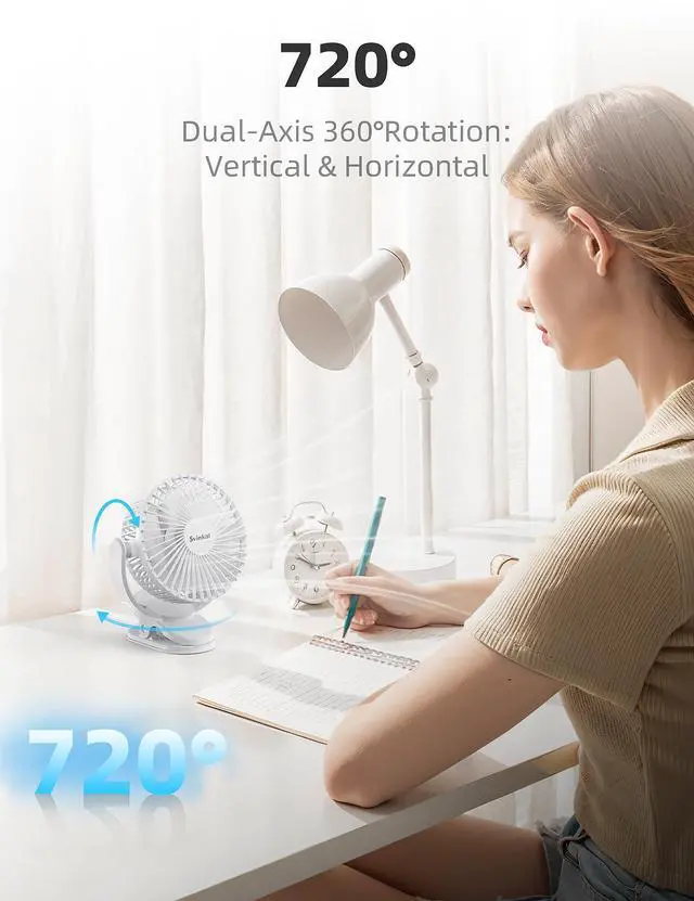 usb Personal Clip on Fan 2400mAh Battery Operated 6in, Type C, 3 Speed, 720 adjustment, Small Portable Fan for Table, Bedroom, Desk, dormitory, Camping, Stroller, Golf Cart