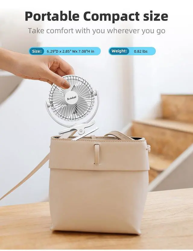 Portable fanCompact sizeCan be easily stored in any travel bag, adding more fun to your trip. Support 360° horizontal rotation and 360° vertical rotation. Size: 6.29"D x 2.85" Wx 7.08"H inches, Weight: 0.82 lbs