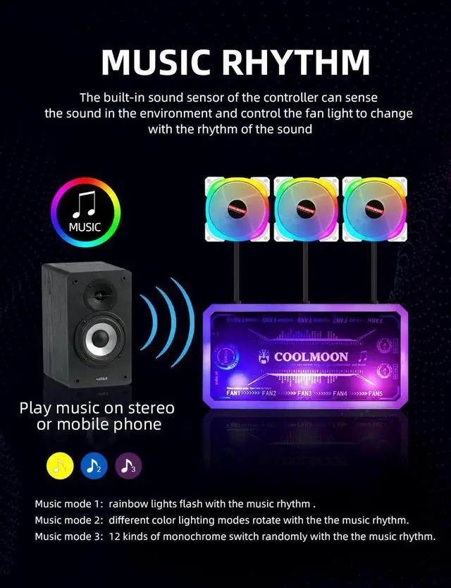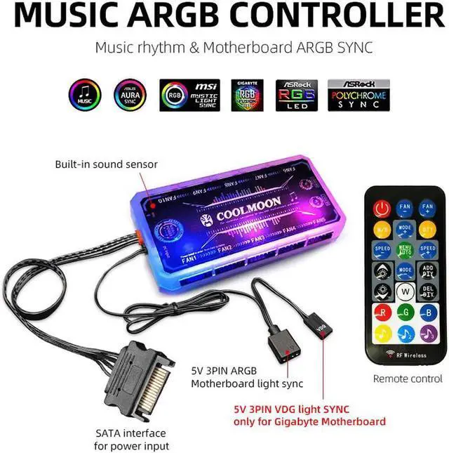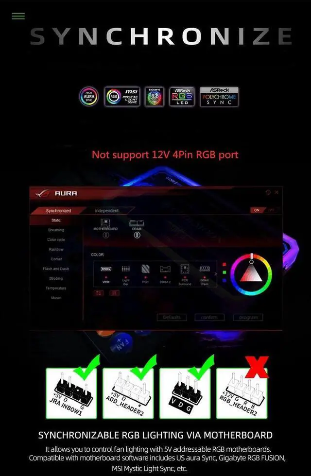 Connect Motherboard:It allows you to control fan lighting with 5V addressable ARGB motherboards,Compatible with motherboard software includes US aura Sync,Gigabyte ARGB FUSION,MSI Mystic Light Syne,etc.
