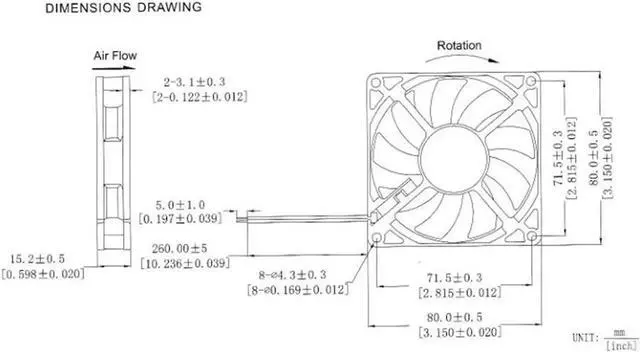Dimensions: 80x80x15mm.