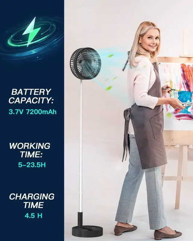 Remote Control & Bulit-in 7200mAh Battery: The AICase standing/desk fan runs on 7200mAh large rechargeable battery, 4 hours full-charged, ensure wireless working 5.5 ~ 23.5 hours, 3-speed, working time depends on different speed