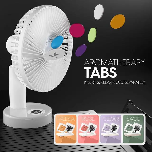 Rotating Fan with Aromatherapy - Our portable clip on fan creates the perfect ambiance with the LED light base, featuring multiple brightness settings to suit any moment. Add a personal touch with our separately sold aromatherapy scent tabs, available in Freesia, Rose, Cedar, and Sage, for a soothing, fragrant breeze that turns every room into your sanctuary.