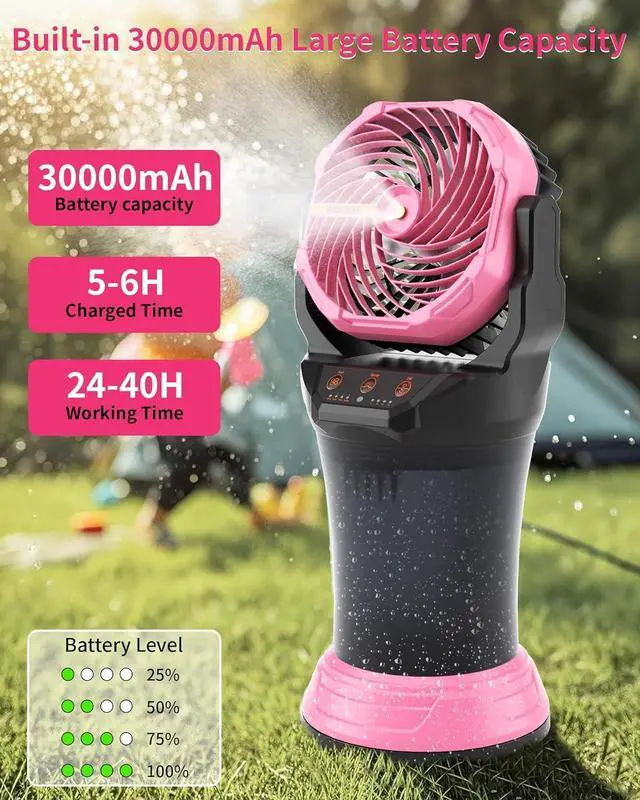 WESTTREE Upgraded Misting Fan Portable - WESTTREE this battery powered misting fan rechargeble built-in 30000mAh large battery capacity, it has 12V fast charging (4-6 hours), 60-hour runtime, and versatility for camping, picnics, parties, BBQ and RV patiosits likely a battery-powered outdoor fan with optional lighting (like a camping fan or patio cooler fan).