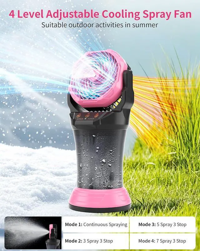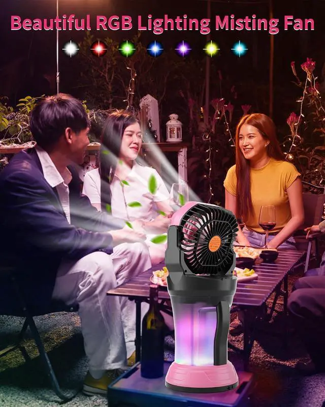 RGB Light Mode & Battery Indicator - This indoor/outdoor misting fan can cool down quickly while also featuring three modes of RGB lighting - Fixed Color, Fading Color, and RGB Walking Light, so you can switch between the desired light modes. Battery level indicator clearly shows the remaining runtime (25%/50%/75%/100%).