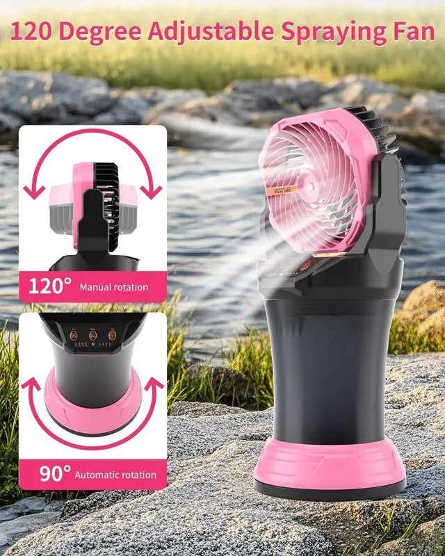 Multi-Angle Battery Operated Floor Fan - The mist fan features a 270° manual head adjustment tilt + 120° auto oscillation for full body coverage and cooling, so you can enjoy the coolness of a WESTTREE brand misting fan anytime, anywhere, such as in a tent, on the lawn, on a table, or in an RV for hands-free comfort.