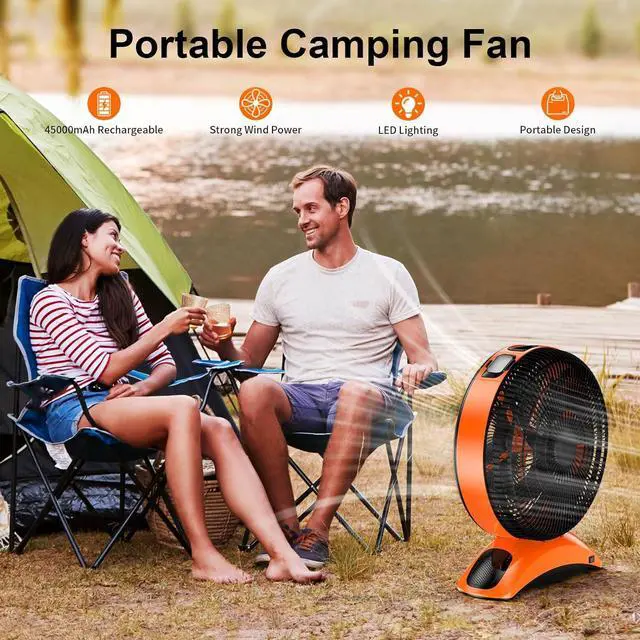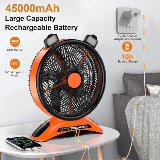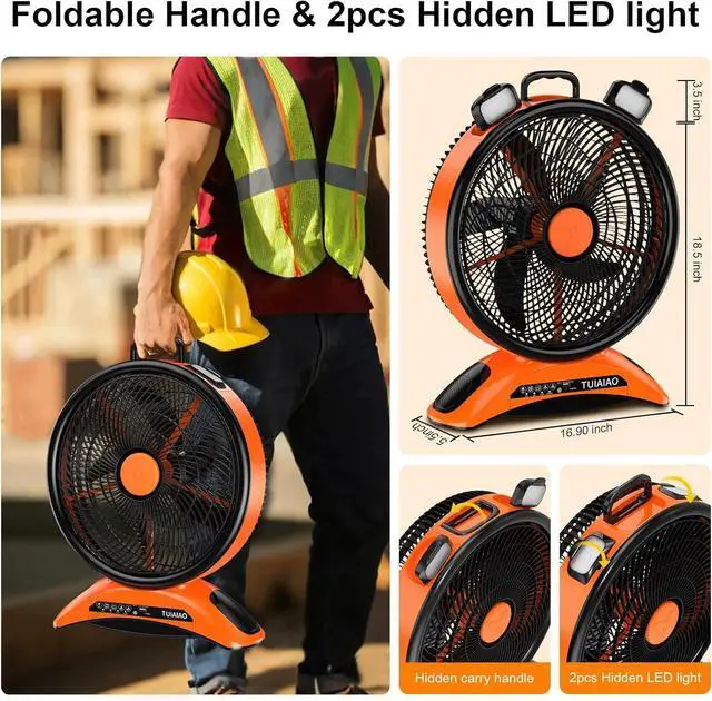 Portable & Easy to Carry: This cordless outdoor fan features a hidden top handle for effortless transport, ideal for camping tents, fishing trips, picnics, and other outdoor adventures. Its sturdy base doubles as an indoor&outdoor table fan, fitting seamlessly on desks, dining tables, and floorseven serving as a reliable construction site fan, industrial ventilator, or home ventilation solution. The durable build ensures stability in any setting, while the compact design prioritizes portability without compromising functionalit