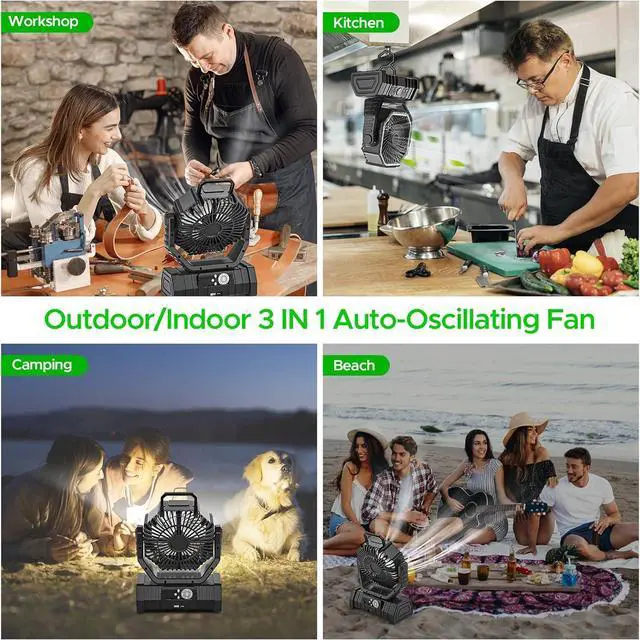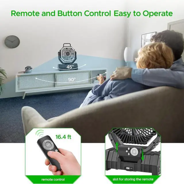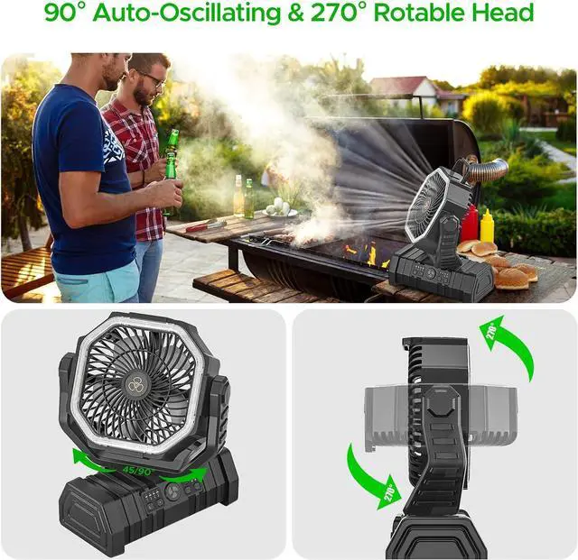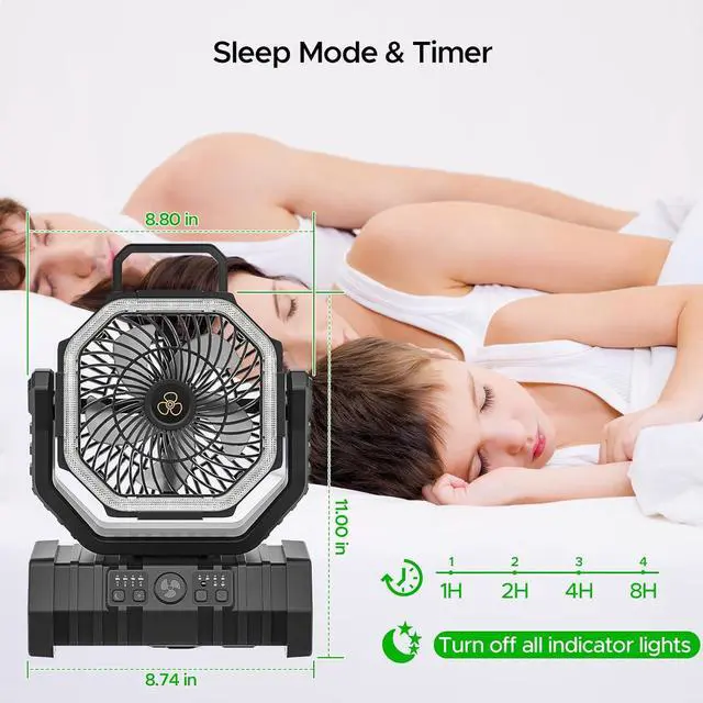 Working Long TimeBuilt-in 20, 000mAh polymer battery camping fan can run for 60 hours at low speed and 16 hours at maximum speed; 5V/3A type-C input/output port and a 5V/2A USB output port for charging the fan conveniently, or use it as a power source to power other devices mobile phones, cameras, GPS, iPod. It' s a lifesaver during camping, travel, power outages, and hurricane season.