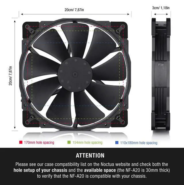 While more and more PC cases support 20cm intake, side-panel or exhaust fans, many of the bundled stock units and available aftermarket options are of questionable quality. By contrast, the NF-A20 is a true premium grade solution worthy of Noctuas award-winning A-series.