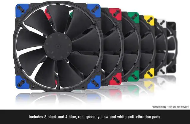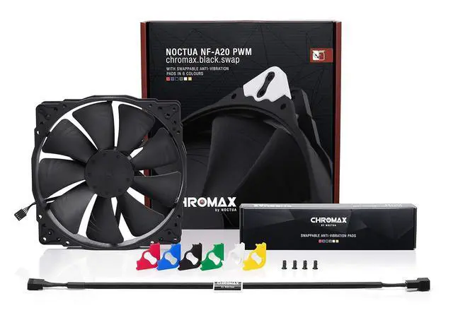 Having received dozens of awards and recommendations from international hardware websites and magazines, the NF-A20 has established itself as a default choice when it comes to premium-quality 200mm fans. The chromax.black.swap edition combines the NF-A20s signature quiet cooling performance with an attractive all-black design and a bundle of swappable red, white, blue, green, yellow and black anti-vibration pads that allow the colour-customisation of the fan to match individual build colour schemes. For further customisation, a wide range of accessories such as coloured cables and anti-vibration mounts are available separately. Topped off with Noctuas trusted premium-grade SSO2 bearing and more than 150,000 hours MTTF, the NF-A20 PWM chromax.black.swap is the perfect choice for all users who value individual, focused build aesthetics just as much as class-leading quality and performance.