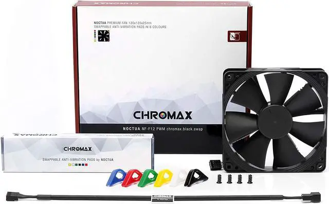 Having received more than 100 awards and recommendations from international hardware websites and magazines, the NF-F12 is one of Noctuas most renowned and popular 120mm fans. Its outstanding static pressure performance and the FocusedFlow frame make it ideal for use on heatsinks and radiators. The chromax.black.swap edition combines the NF-F12s signature quiet cooling performance with an attractive all-black design and a bundle of swappable red, white, blue, green, yellow and black anti-vibration pads that allow the colour-customisation of the fan to match individual build colour schemes. For further customisation, a wide range of accessories such as coloured cables, additional anti-vibration pads and anti-vibration mounts are available separately. Topped off with Noctuas trusted premium-grade SSO2 bearing and more than 150,000 hours MTTF, the NF-F12 PWM chromax.black.swap is the perfect choice for all users who value individual, focused build aesthetics just as much as class-leading quality and performance.