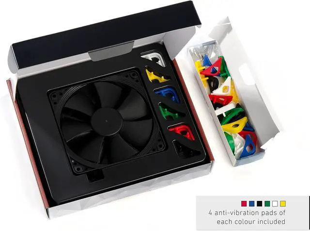 The NF-F12 PWM chromax.black.swap comes with 4 black, white, red, blue, green and yellow NA-AVP1 anti-vibration pads respectively. By combining the various colours with black or leaving off the pads on one side, the fan can be coordinated with most popular build colour schemes out of the box. Additional NA-SAVP1 sets for outfitting both sides in one colour can be purchased separately.
