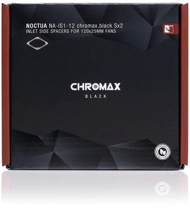 The NA-IS1-12 Sx2 is a set of two 5mm thick intake side spacer frames for Noctua 120x25mm fans that can help to improve both acoustics and performance in suction or pull type applications where the fan draws air through obstacles such as grills, perforated plates, mesh panels, filters or radiators. By offsetting the fan from the obstacle, the NA-IS1 inlet spacer reduces influx turbulences, which can, depending on the application and fan model, not only improve airflow but also significantly reduce overall noise levels and make the fan sound more pleasant to the ear. Designed to replace the fans stock NA-AVP1 anti-vibration pads, the NA-IS1-12 are compatible with all current square-frame Noctua 120x25mm fans and extremely straightforward to install: For case fan applications, either the supplied self-tapping screws or the included NA-AV3 anti-vibration mounts can be used to sandwich the spacer between the fan and the case panel. For radiator mounting, both M3 and UNC 6-32 screws are supplied. In sum, the NA-IS1-12 Sx2 set is a simple yet highly effective fine-tuning measure for suction type applications where a reduction of influx turbulence can lead to improved airflow and acoustics. The chromax.black variant is a perfect match for black chromax or industrialPPC line fans.