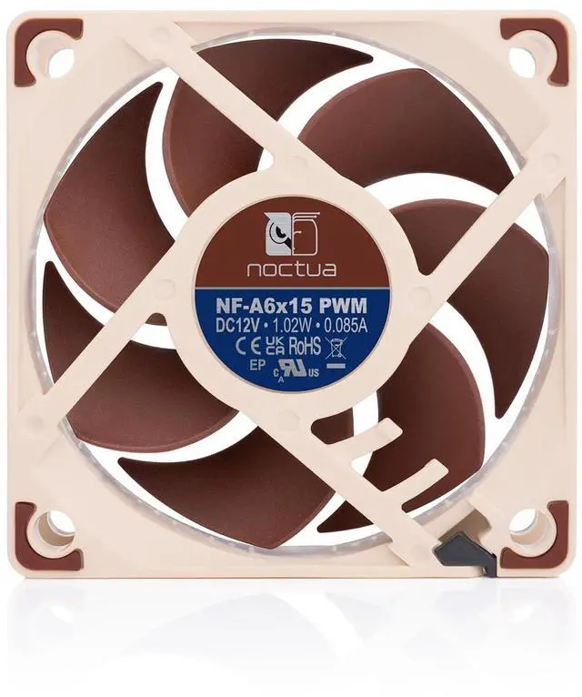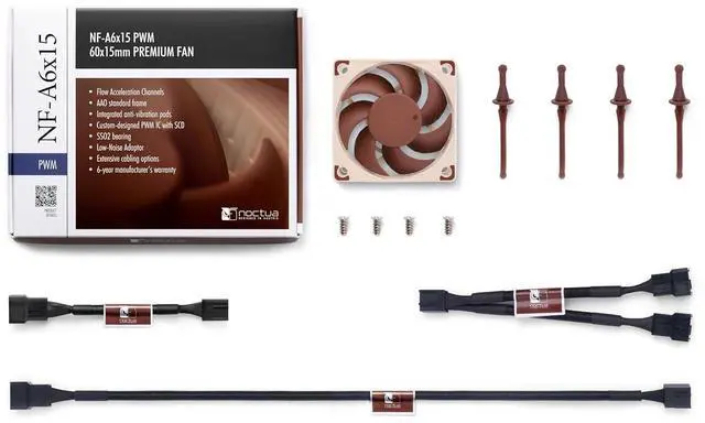Featuring advanced aerodynamic design measures such as Flow Acceleration Channels and Noctuas AAO frame, the NF-A6x15 is a highly optimised, premium-quality quiet fan in size 60x15mm. The PWM version uses Noctuas custom-designed NE-FD1 IC for fully automatic speed control via 4-pin fan headers and comes with a Low-Noise Adaptor to reduce the maximum speed during PWM control from 3500 to 3050rpm. Its superb running smoothness, SSO2 bearing and Noctuas trusted premium quality make it an elite choice for the highest demands.