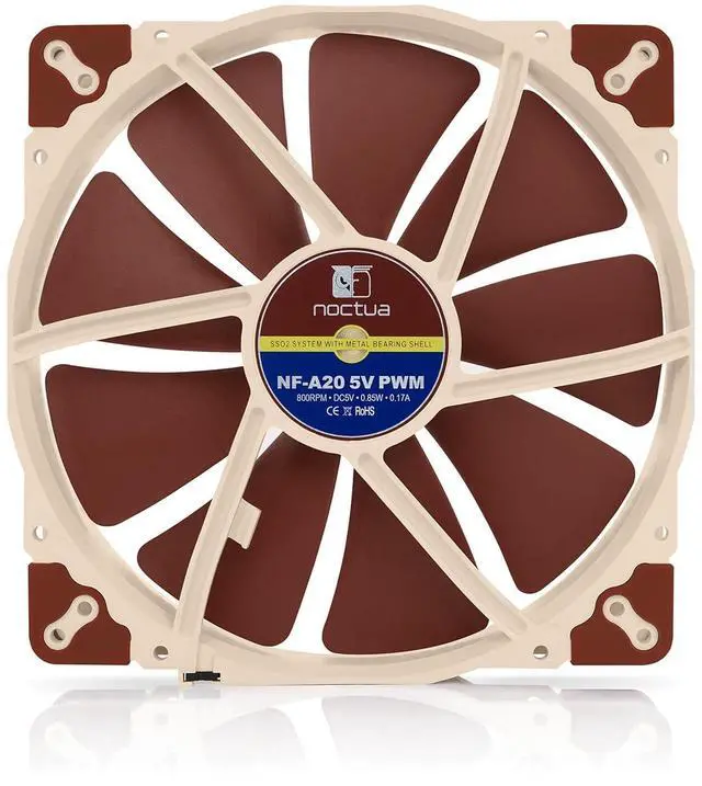 The NF-A20 5V PWM is a PWM-enabled 5V variant of Noctuas award-winning, premium-quality NF-A20 200mm fan. Featuring an AAO (Advanced Acoustic Optimisation) standard frame and sophisticated aerodynamic design measures such as Flow Acceleration Channels, the NF-A20 is renowned for its superior performance and outstanding quietness of operation. Smooth Commutation Drive technology and Noctuas reference class SSO2 bearing ensure superb running smoothness and excellent long-term stability. Topped off with the included USB power adaptor cable and OmniJoin adaptor set, the NF-A20 5V PWM is a premium choice for demanding 5V applications that require PWM control.