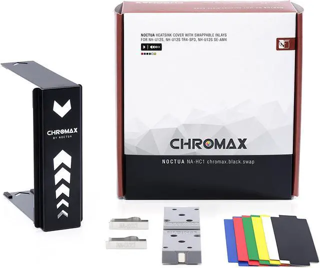 The NA-HC1 chromax.black.swap heatsink cover is an add-on accessory for Noctuas award-winning NH-U12S, NH-U12S TR4-SP3, NH-U12S SE-AM4 and NH-U12S DX-3647 CPU coolers. Made from high-quality aluminium with black powder-coating finish and including swappable inlays in black, white, red, blue, green and yellow, it allows users to colour-customise the cooler in order to coordinate it with popular build colour schemes such as all black, black and white or black and red. Thanks to the easy, straightforward installation, changing the looks of your NH-U12S cooler only takes a few minutes and doesnt even require taking it off the CPU. Combined with the chromax.black.swap edition NF-F12, fan, the NA-HC1 gives you endless possibilities to design your very own, individual NH-U12S that looks just as great as it cools!