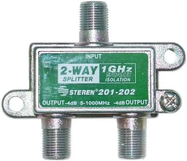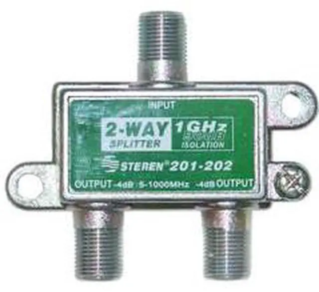 This F-Pin cable coax splitter converts back and forth between an F-pin female jack and two F-Pin female jack connections. This splitter is perfect for splitting a cable or satellite feed for use on multiple TVs.