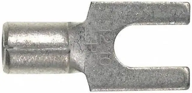 This terminal features a fork design for fast and easy installation, without the need to remove fasteners. It also features internal barrel serrations to help ensure good wire contact and maximum tensile strength. Fork Terminal, Std, #10 Stud, Bare, PK100