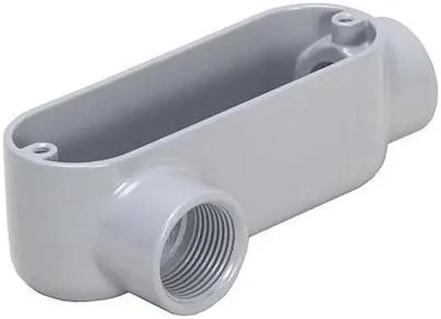 Conduit Outlet Body, Overall Width 2 11/16 in, Overall Height 1 7/8 in, Overall Length 5 15/16 in, Weight 0.415 lb, Trade Size 1 in, Compatible Conduit Trade Size 1 in, Hub Size 1 in, Aluminum, Compatible Conduit Type IMC, RMC, Back Type Flat, Body Capacity 12 cu in, Body Style LR, Body Type Conduit Outlet Body, Color Silver, Connection Type Threaded, Finish Powder Coated, For Use With IMC, RMC, Hazardous Location No, Hub Style Threaded, Number of Hubs 2, Number of Pieces 5, Shape LR.