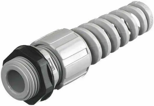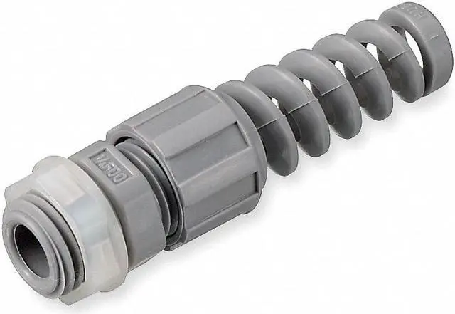 Liquid Tight Cord Connector with Strain Relief, Cord Dia. Range 0.25 in to 0.31 in, Box Connection 1/2 in MNPT, Material - Cord Connector Nylon, External Strain Relief Material Nylon, Gland Color Code No Code, Body Color - Cord Connector Gray, Number of Cords 1, Style - Connector Straight, Strain Relief Type Spiral, External Strain Relief Length 2 3/16 in, Length - Box to End of Connector 1 1/8 in, Insulated Yes, Standards CSA LR27378, UL E54218 (M), Hazardous Location Rating Not Rated