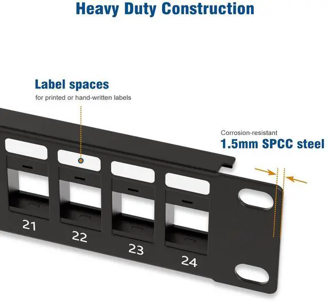 The Patch Panel is made from SPCC steel for long lasting use and the ability to withstand the weight and torque when use together with cables and keystone jacks.
