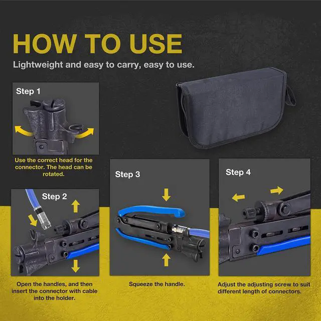1. Durable and versatile coax crimper for F connectors/Coaxial cable connector, compatible with rg6, rg59, rg11, and 75-5-7 Metric and Imperial F-Head. Ergonomic anti-skid handle for comfortable use.