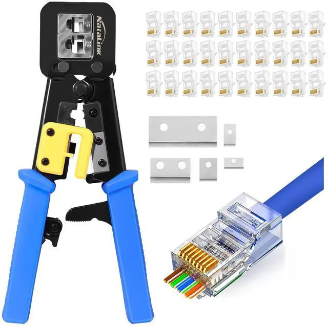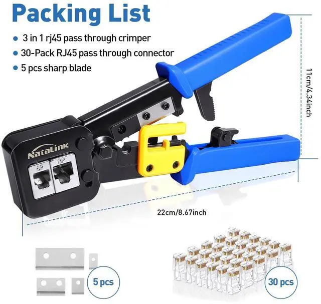 This package includes pass through rj45 crimp tool, 30pcs cat 6 pass through connectors and 5 pcs replacement blades.