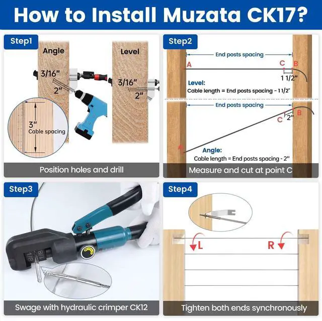 ![]() Cable Railing Kit CK17 | ![]() Complete Set WA02 | ![]() Level Sleeve CR13 | ![]() Angle Sleeve CR70 | ![]() Crimper and Cutter CK12 | ![]() Drill Guide CT24 | ![]() Wire Rope WR02 |
