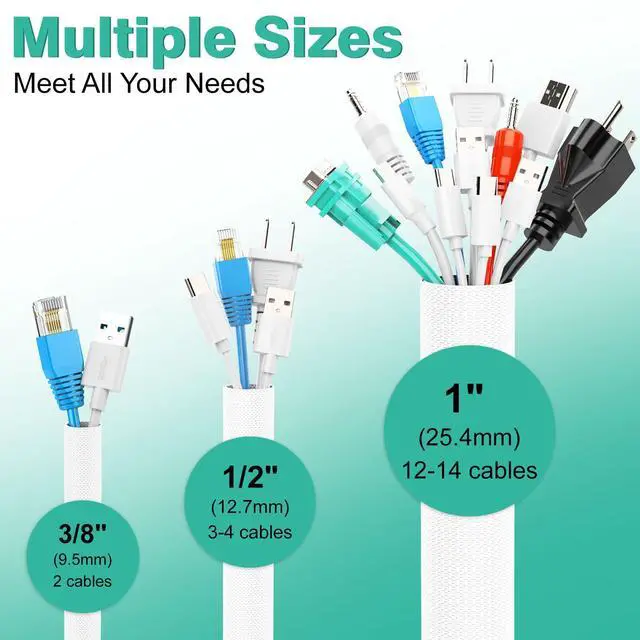 Easily to use ,diferent size: 10ft-1in, 10ft -1/2in, 10ft -3/8in, 6.6ft,cord cover to hold 2 or 14 cables, well protect your wires from a chewing-like pet.